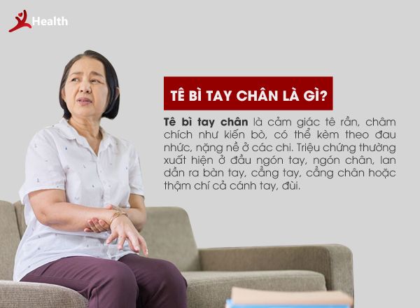 Tê bì tay chân là cảm giác tê rần, châm chích như kiến bò, có thể kèm theo đau nhức, nặng nề ở các chi. Triệu chứng thường xuất hiện ở đầu ngón tay, ngón chân, lan dần ra bàn tay, cẳng tay, cẳng chân hoặc thậm chí cả cánh tay, đùi.